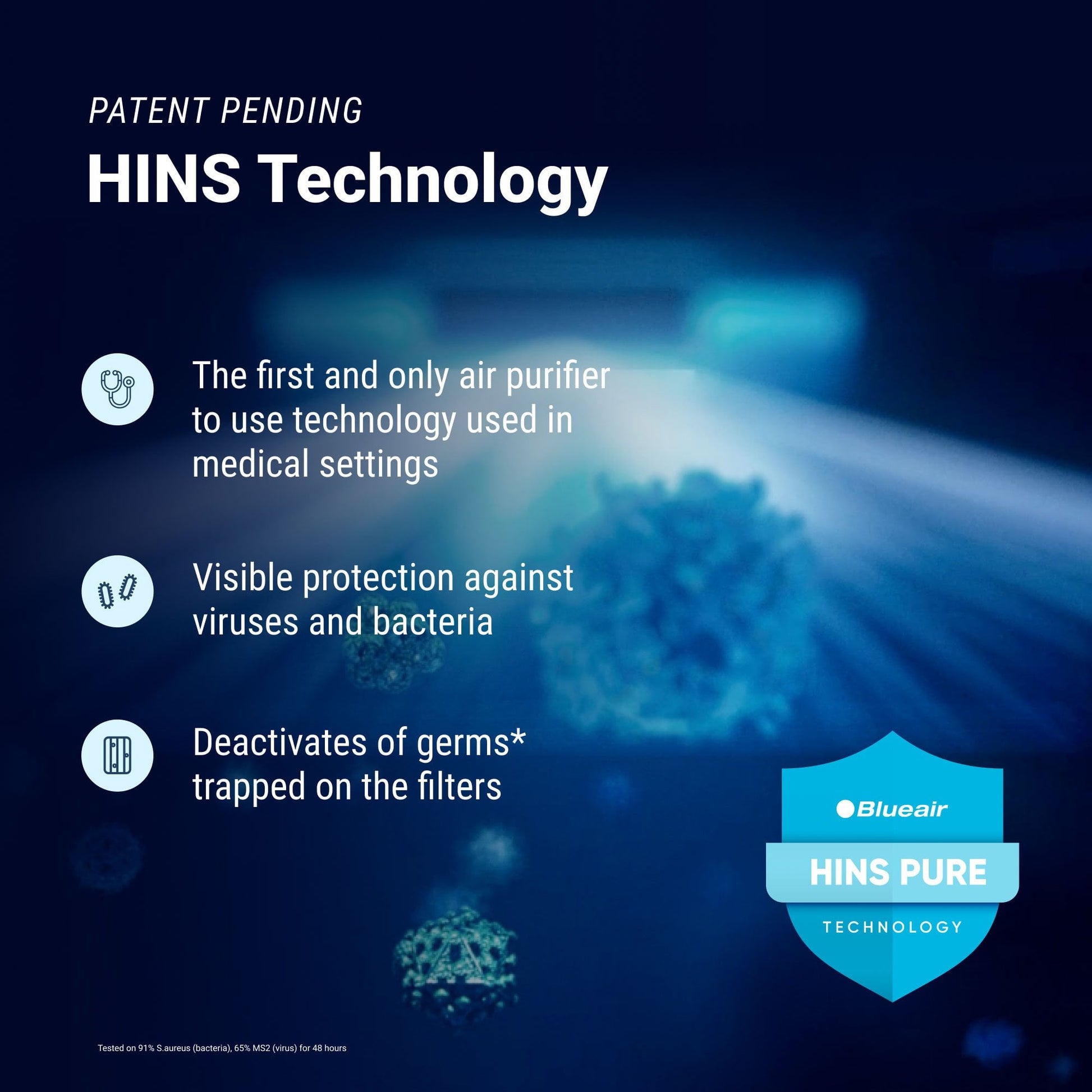HINS technology neutralizes trapped germs¹ on filters using specialized light, setting a new standard in air quality.