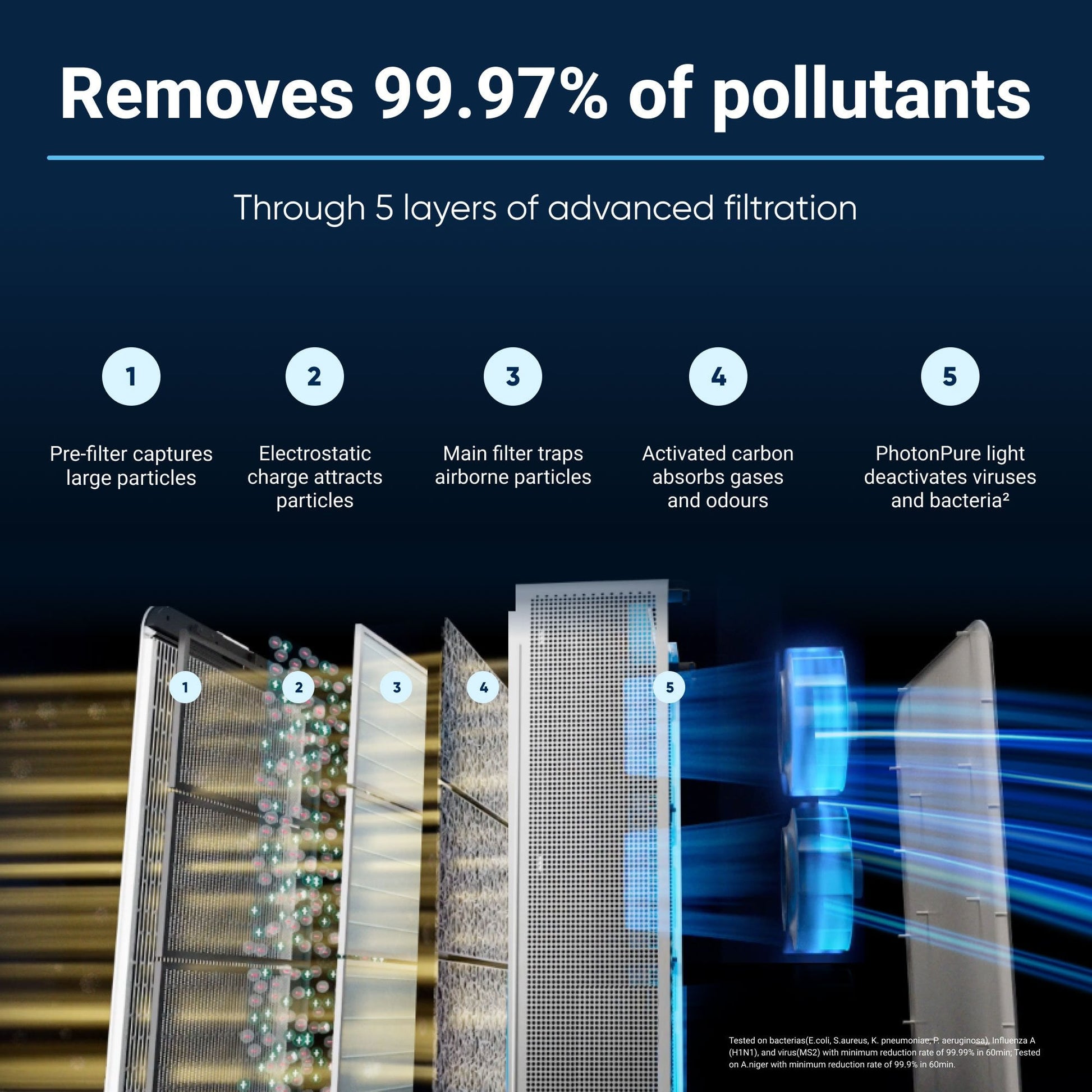 With the unique filter design at least 99.97%³ of airborne particles, even down to 0.1 microns, are removed, while using less energy and producing less noise.
