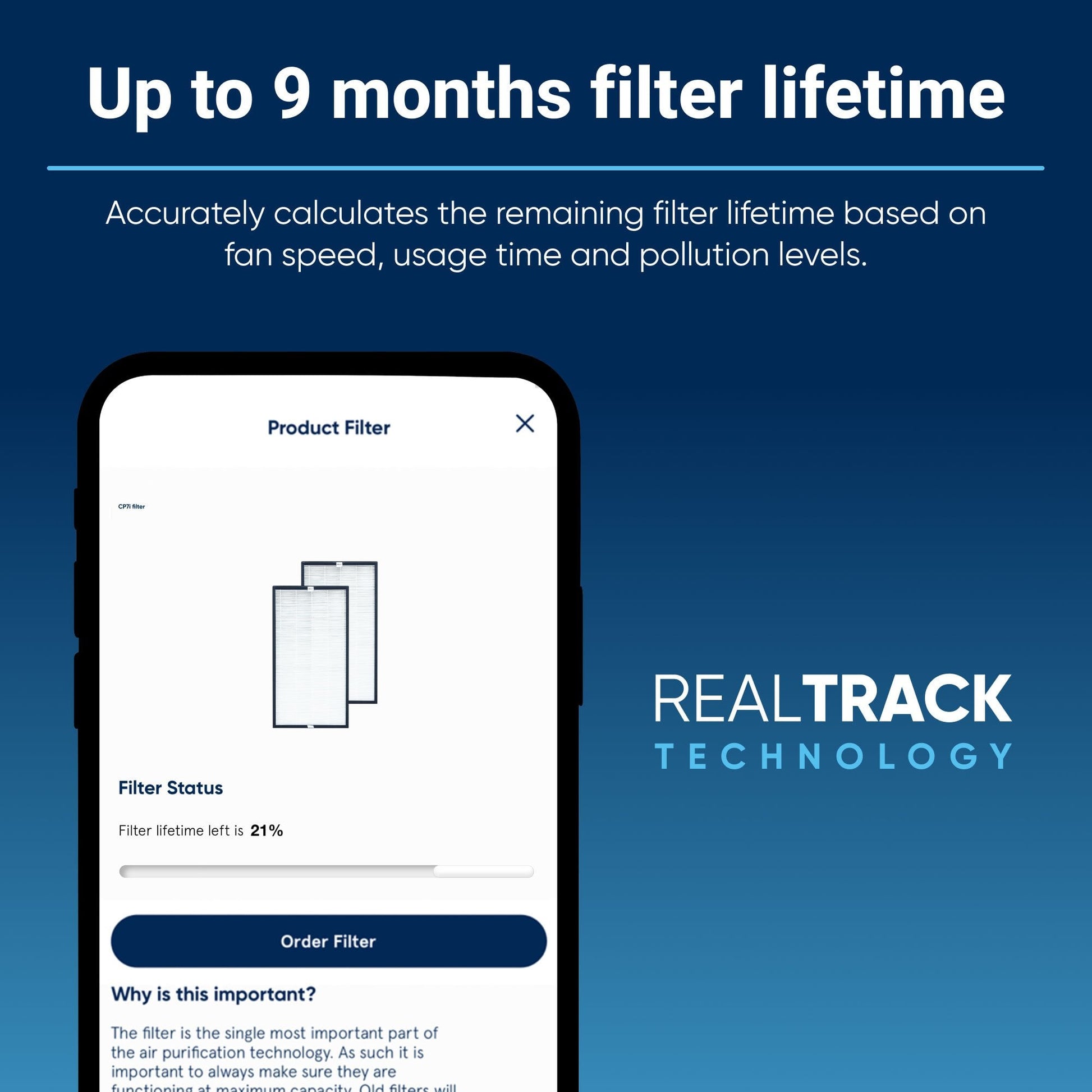 The proprietary RealTrack algorithm accurately calculates the remaining filter lifetime based on fan speed, usage time and pollution levels.
